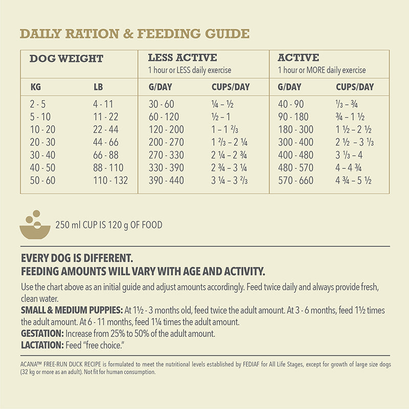 ACANA Free-Run Duck is a limited-ingredient food featuring 50% duck, a single, easily digestible animal protein that is perfect for dogs with food sensitivities or choosy eaters of all breeds and life stages.