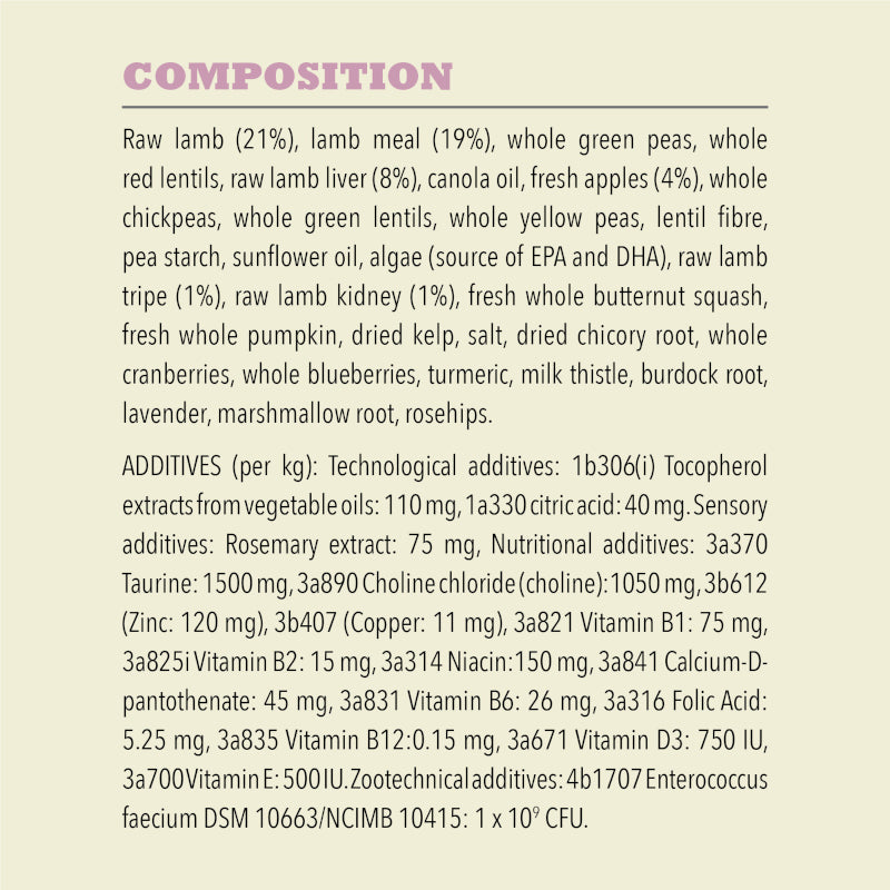 Our ranch-raised, grass-fed lamb arrives at our kitchen raw, in richly nourishing WholePrey ratios of meat, liver, and tripe that mirror the natural diet, while whole, delicious apples, squash, and pumpkin support healthy digestion.