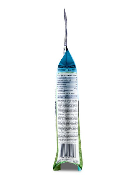 Ingredients: Lamb Tripe, Lamb, Lamb Liver*, Lamb Heart*, Lamb Kidney*, Lamb Lung*, Lamb Bone, New Zealand Green Mussel, Inulin from Chicory, Dried Kelp, Sea Salt, Parsley, Minerals (Potassium Bicarbonate, Zinc Amino Acid Complex, Copper Amino Acid Complex, Selenium Yeast, Manganese Amino Acid Complex), Vitamins (Vitamin E Supplement, Vitamin B1 Supplement, Vitamin D3 Supplement, Folic Acid). Naturally preserved with mixed tocopherols. *Depending on seasonal availability will be temporarily substituted with sheep.