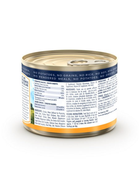 Ingredients: Chicken, Chicken Broth, Chicken Liver, Chicken Heart, Chick Peas, New Zealand Green Mussel, Chicken Bone, Dried Kelp, Sea Salt, Minerals (Zinc Amino Acid Complex, Copper Amino Acid Complex, Selenium Yeast, Manganese Amino Acid Complex), Vitamins (Vitamin E Supplement, Vitamin B1 Supplement, Vitamin B5 Supplement, Vitamin D3 Supplement, Folic Acid).